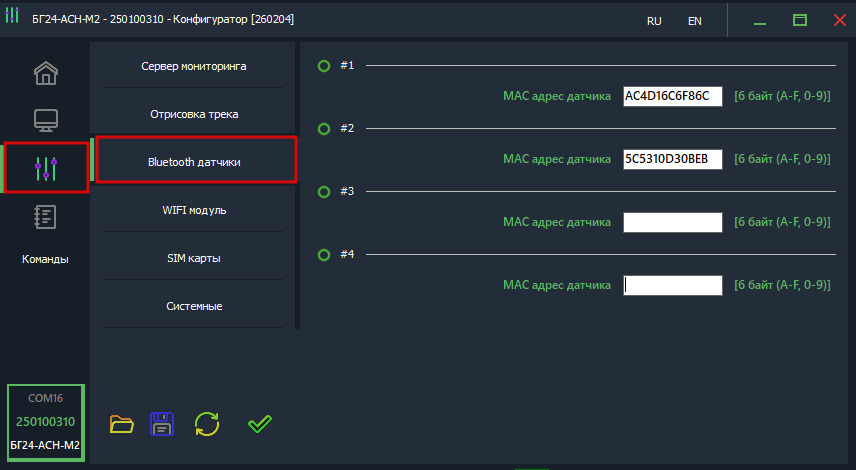 Проводные ДУТ и беспроводные датчики используют общие адреса. При добавлении MAC-адреса беспроводного датчика убедитесь, что выбранный адрес не совпадает с адресом уже подключённого проводного датчика.