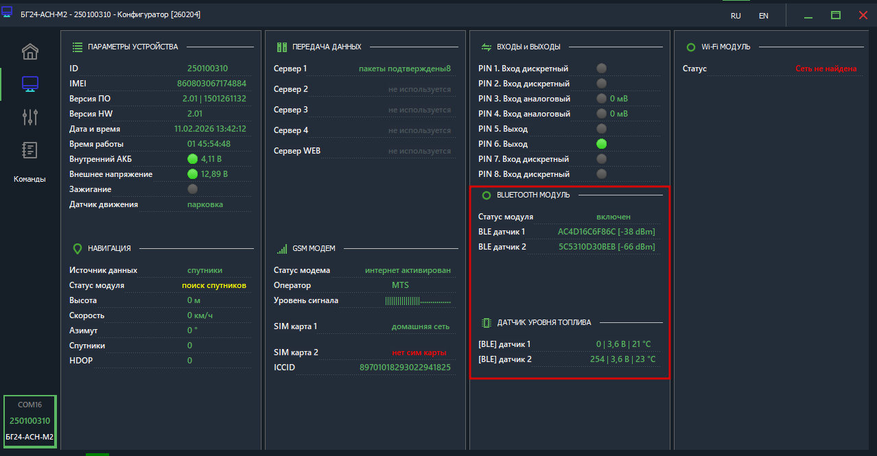 Устройство БГ24-АСН-М2 поддерживает приём данных от беспроводных датчиков уровня топлива (ДУТ) с интерфейсом Bluetooth Low Energy (BLE).