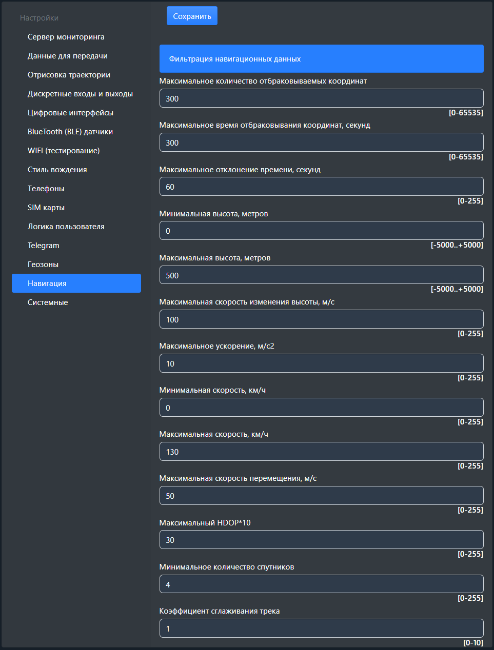 Этот раздел позволяет настроить параметры фильтрации для исключения некорректных навигационных данных.