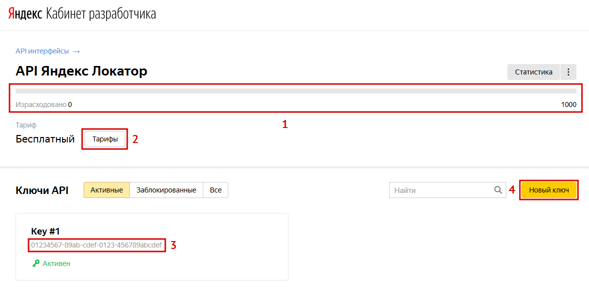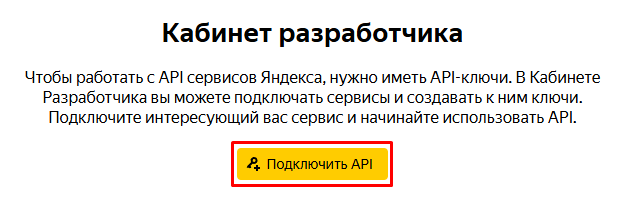 Получить API-ключ в личном кабинете разработчика на сайте Яндекс.